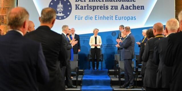 Η Πρόεδρος φον ντερ Λάιεν τιμήθηκε σήμερα με το Διεθνές Βραβείο «Καρλομάγνος» του Άαχεν, το οποίο απονέμεται σε προσωπικότητες που έχουν συνεισφέρει εξαιρετικά στην ευρωπαϊκή ενότητα και ολοκλήρωση.
